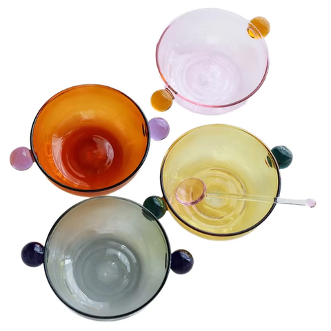Tazón de postre de cristal rosa hecho a mano personalizado al por mayor tazón de fruta de sopa de nueces de vidrio de color borosilicato alto con mango de bola